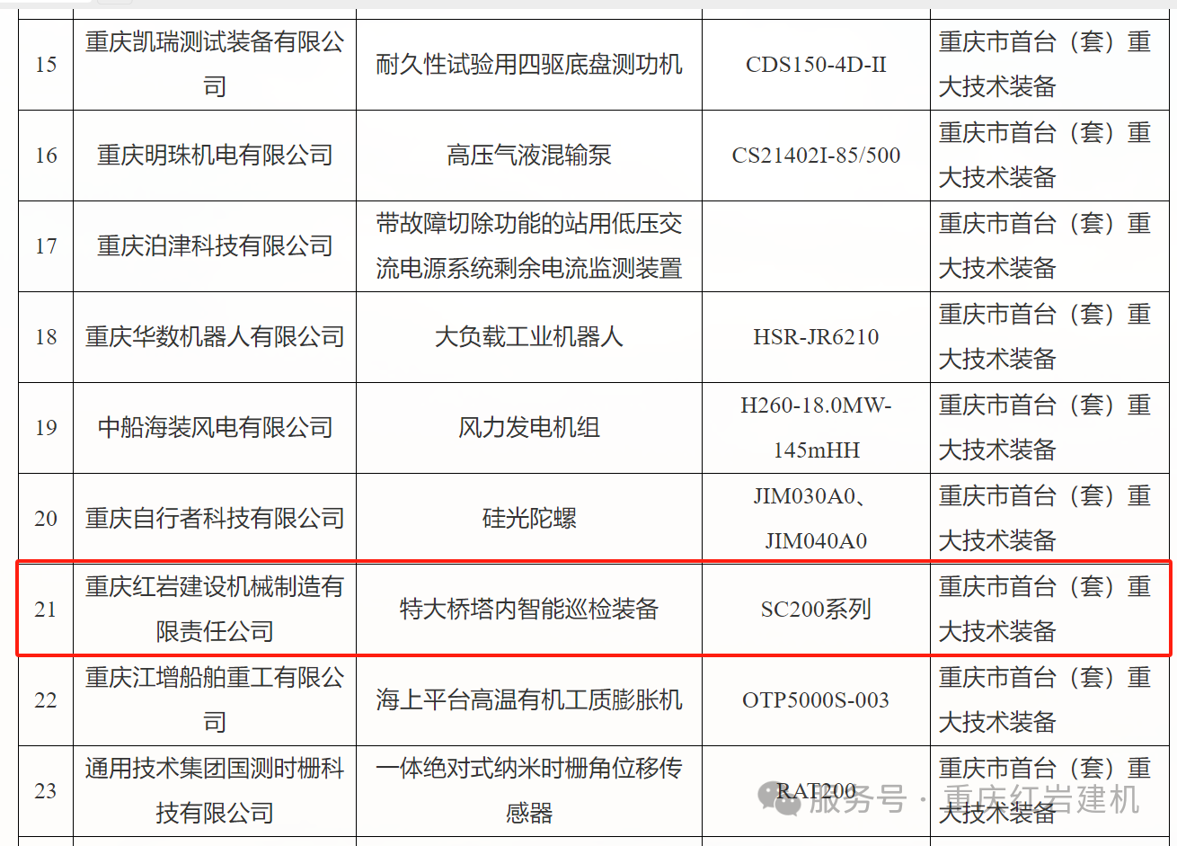 按照《重慶市首臺(套)重大技術(shù)裝備認定管理辦法》(渝經(jīng)信規(guī)范〔2022〕5號)規(guī)定,重慶市經(jīng)濟和信息化委員會已按程序?qū)Φ谌陥蟮闹貞c市首臺(套)重大技術(shù)裝備產(chǎn)品進行了專家評審,共計64個產(chǎn)品通過評審并排序。我司《特大橋塔內(nèi)智能巡檢裝備》排名21,成功入選第三批重慶市首臺(套)重大技術(shù)裝備產(chǎn)品名錄。